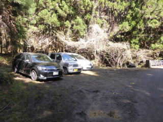 ミツマタ群生地には梅田湖から所々すれ違うのがやっと細い道があり慎重に進むと根本山登山口の駐車場があり、すでに満車でした。屋敷山のミツマタ群生地にはここを左折して林道を歩くようですが満車だったので少し先の駐車スペースがあり2台駐車していた。脇に駐車して車道を歩き始めた。15分ほど登っていくと左下にミツマタの群生地が見えてきた。