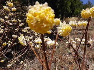 ミツマタ群生地のある屋敷山は、個人所有の山です。所有者の許可を得た「ミツマタ群生地守る会」が食害を受けた杉や雑木の間伐などをするうちに、ほんの数本だった株がここまで広がったそうです。